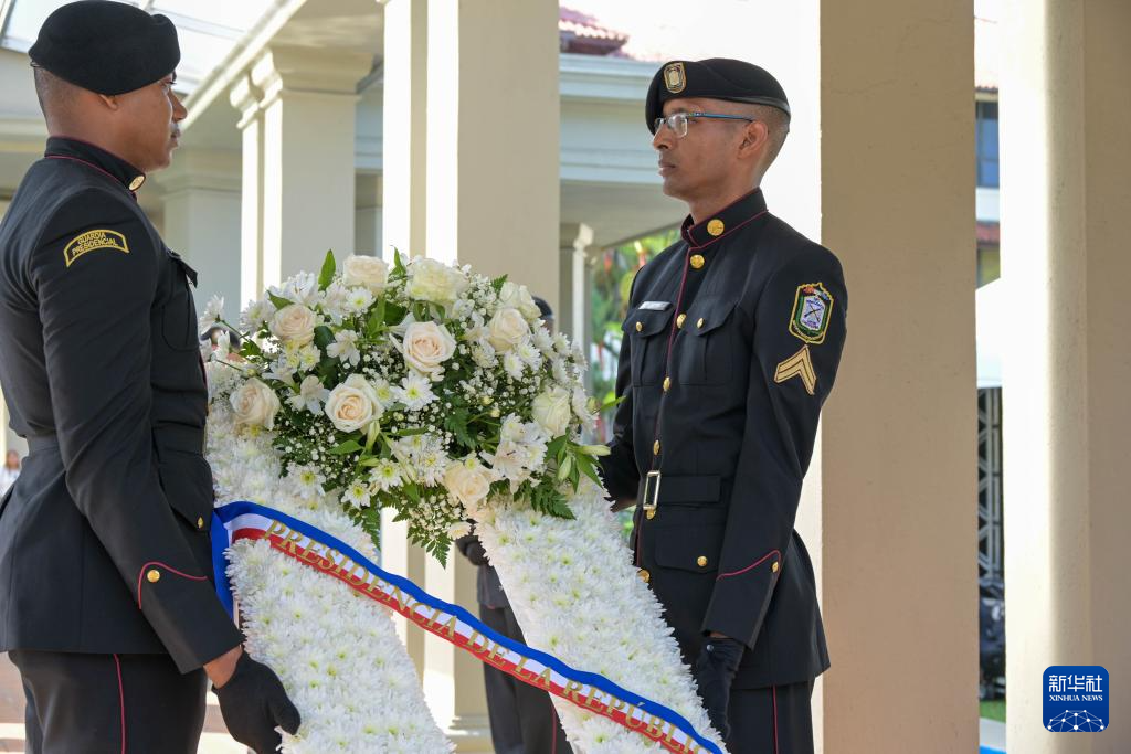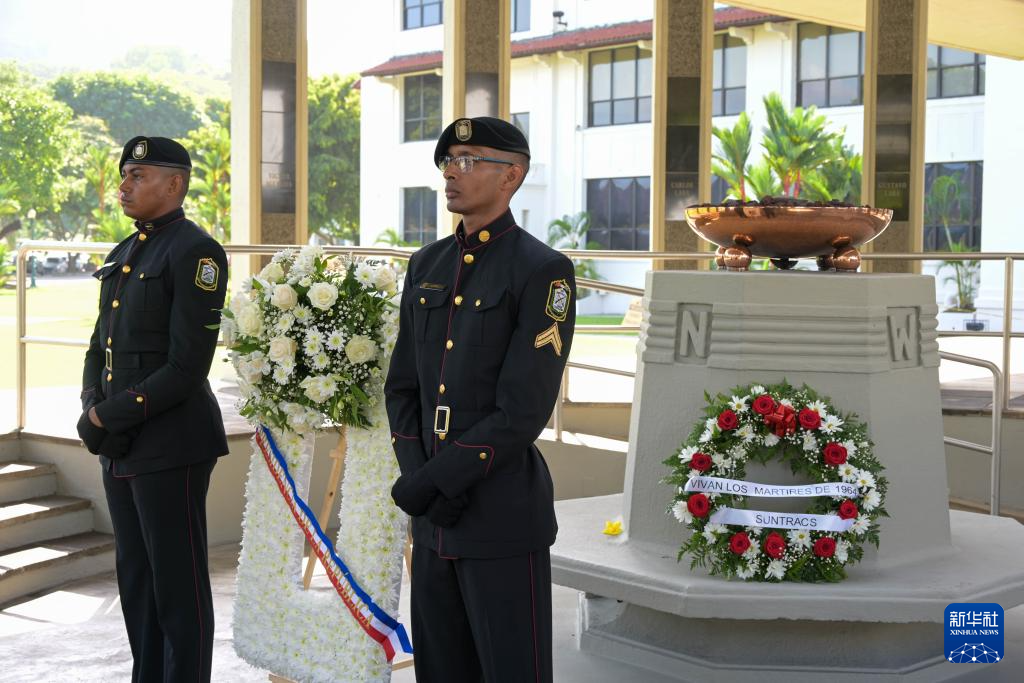 1月9日,在巴拿马首都巴拿马城,两名士兵向纪念“护旗运动”的“永恒之火”纪念碑献花圈。