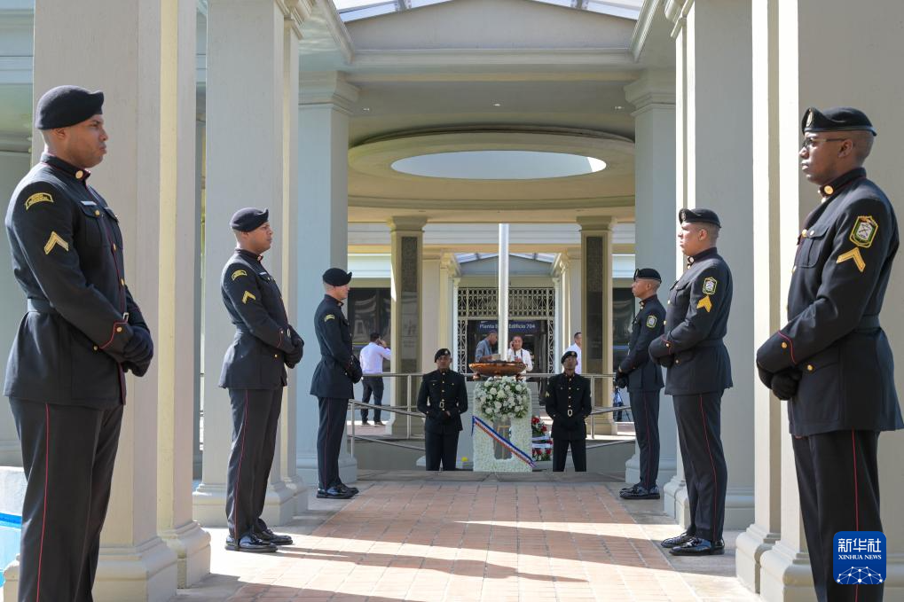 1月9日,在巴拿马首都巴拿马城,士兵们守卫纪念“护旗运动”的“永恒之火”纪念碑。
