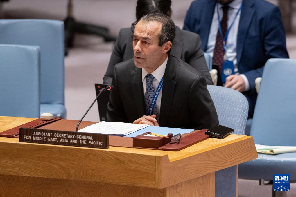 1月12日,在位于纽约的联合国总部,联合国负责中东和亚太事务的助理秘书长哈立德·赫亚里在联合国安理会紧急公开会上发言。