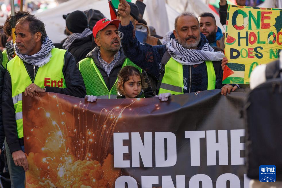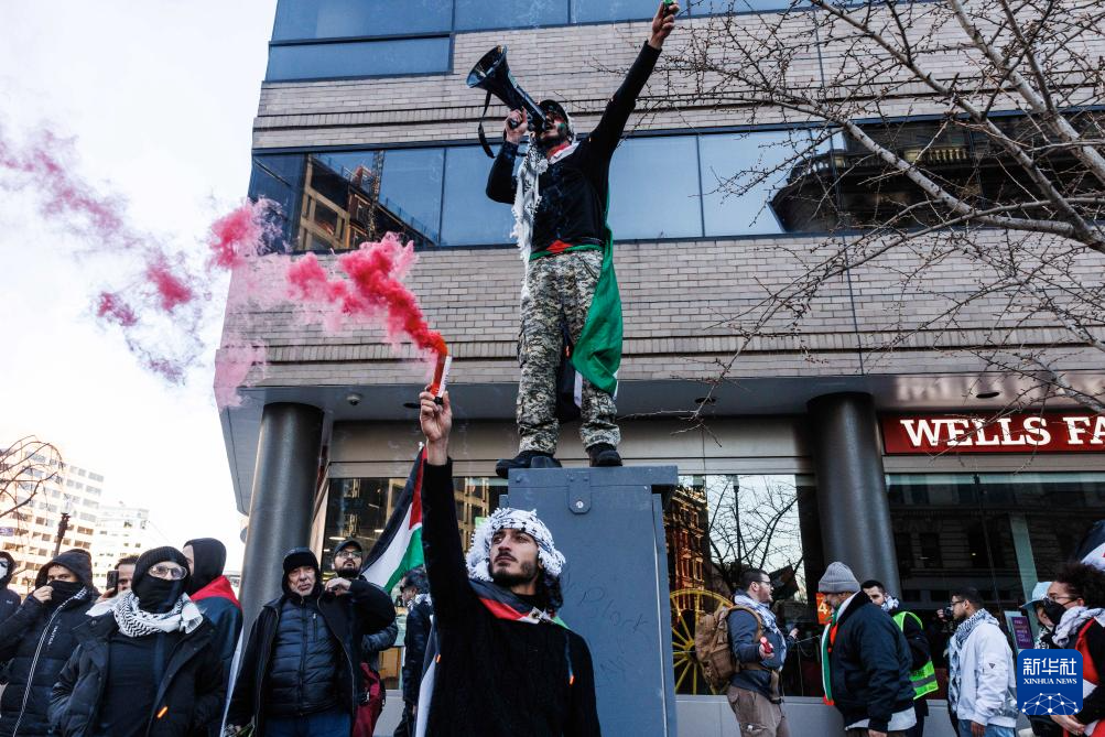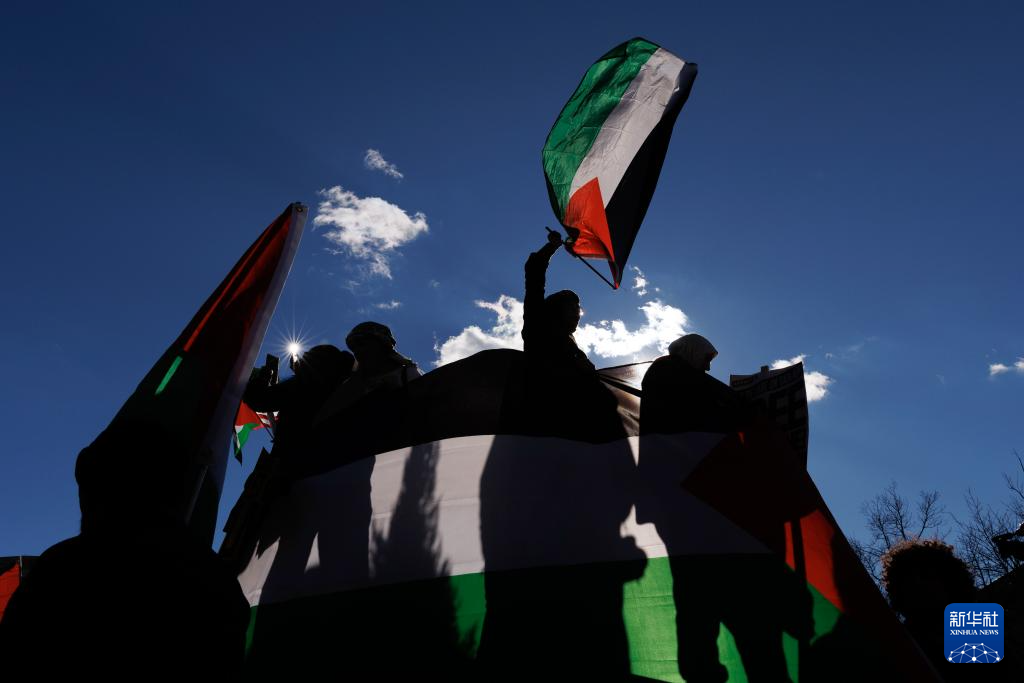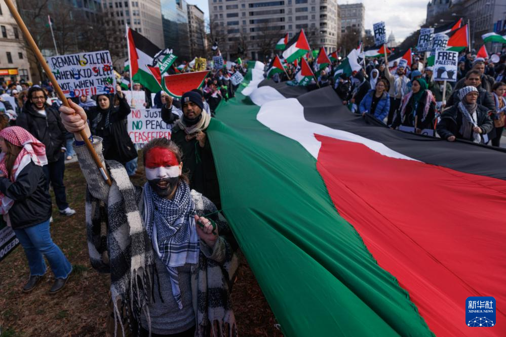 当日,美国首都华盛顿举行声援巴勒斯坦集会游行。大批示威者挥舞旗帜和标语,高喊口号声援巴勒斯坦,呼吁停火。