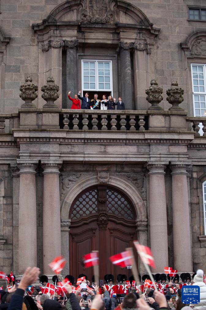 1月14日,丹麦国王腓特烈十世一家在首都哥本哈根克里斯蒂安堡宫的阳台上接受民众祝贺。