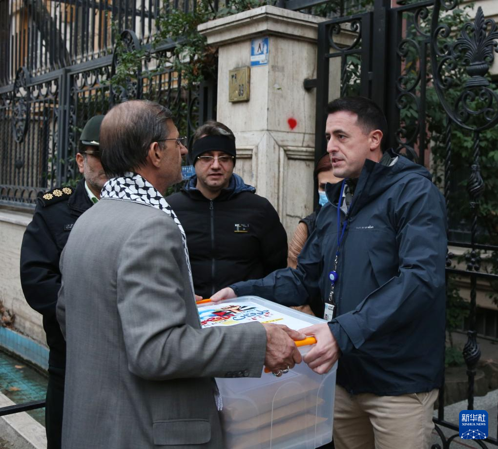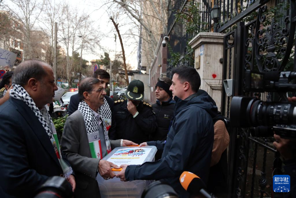 1月14日,集会者代表在伊朗首都德黑兰的联合国驻伊朗办事处门前向联合国代表提交签名文件。