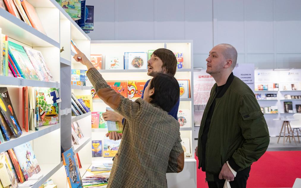 ↑2023年10月18日,在德国法兰克福书展中国展区,参展商向参观者介绍中国图书。