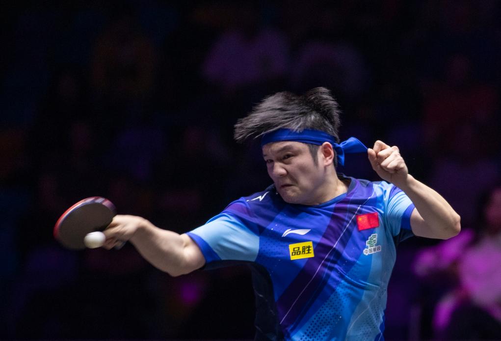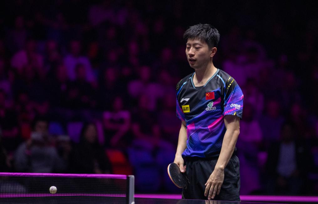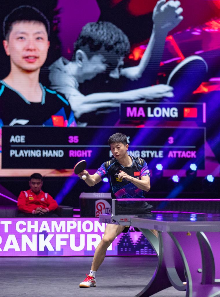 ↑2023年11月4日,马龙在比赛前热身。在男子单打半决赛中,他以4比1战胜法国选手菲利克斯·勒布伦,晋级决赛。