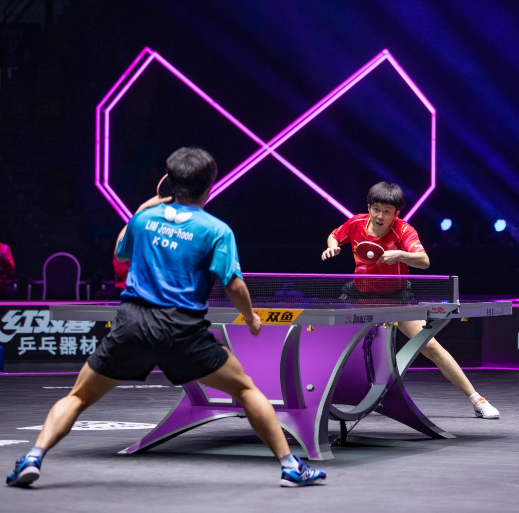 ↑2023年11月3日,王楚钦(右)在比赛中回球。当日,在德国法兰克福举行的2023世界乒乓球职业大联盟(WTT)法兰克福冠军赛男子单打四分之一决赛中,中国选手王楚钦以3比0战胜韩国选手林钟勋,晋级四强。