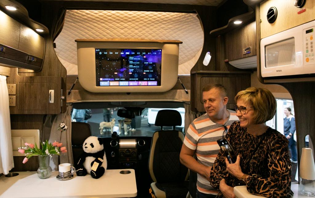 ↑2023年8月28日,人们在德国杜塞尔多夫国际房车展上参观来自中国的戴德房车。