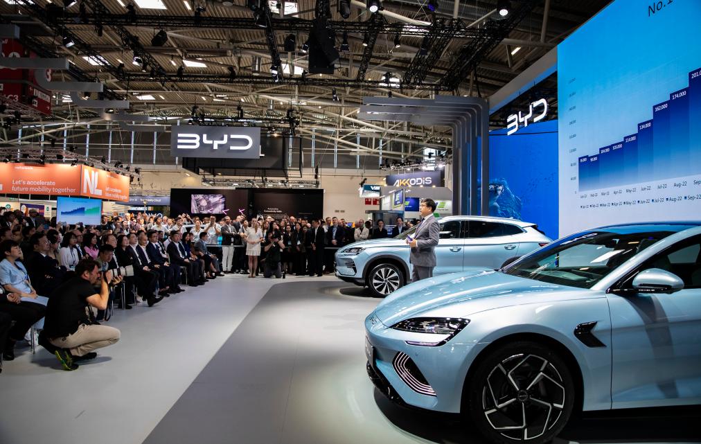 ↑2023年9月4日在德国慕尼黑国际车展媒体预展上拍摄的比亚迪发布会现场。