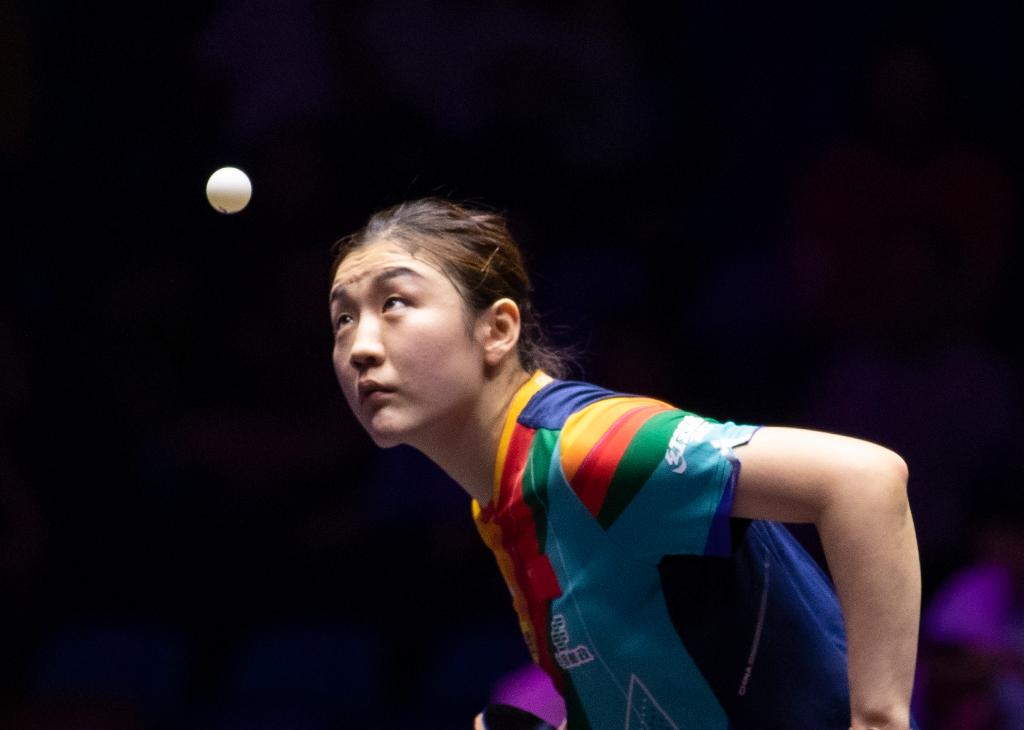 ↑ 2023年11月1日,陈梦在比赛中发球。在女子单打第二轮比赛中,她以2比3不敌罗马尼亚选手斯佐科斯。