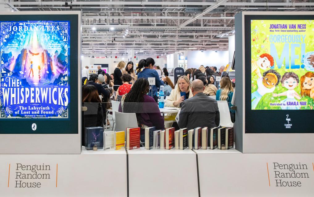 ↑2023年10月18日,人们在德国法兰克福书展上洽谈。