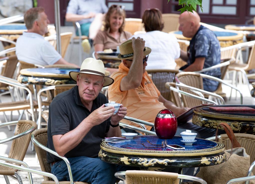 ↑2023年7月14日,在德国曼海姆的路易森公园内的中国园林“多景园”,游客在茶楼喝茶。
