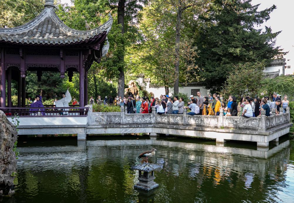 ↑2023年9月30日,人们在德国法兰克福“春华园”中观看中国舞表演。