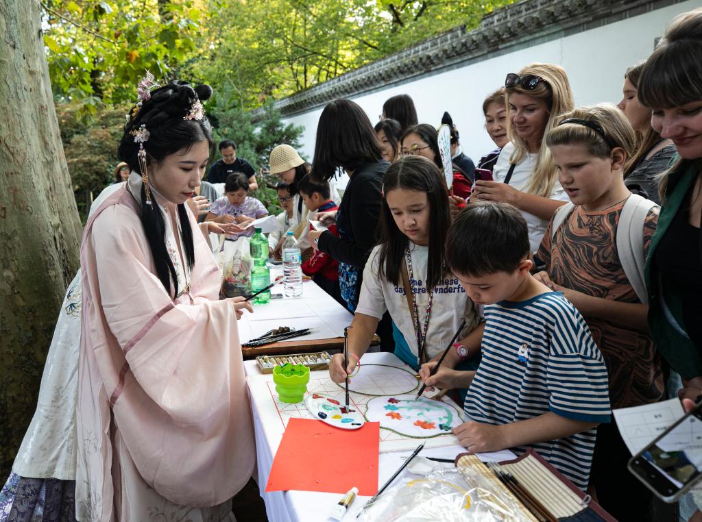 ↑2023年9月30日,人们在德国法兰克福“春华园”中体验扇面绘画。