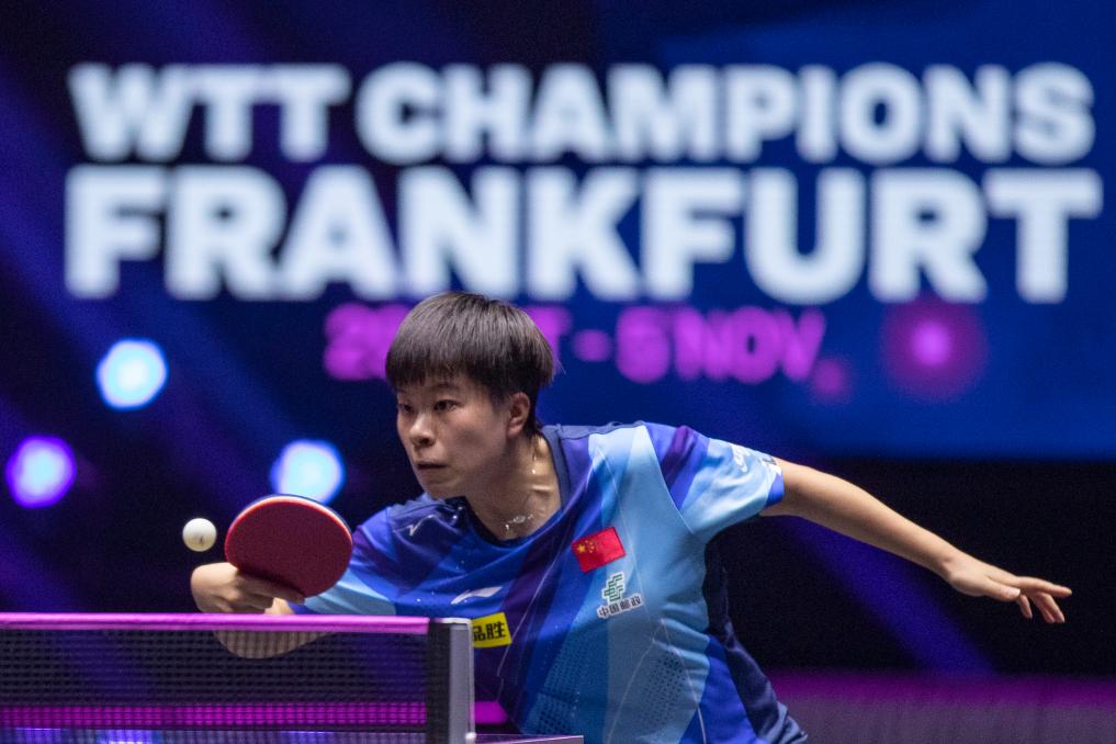 ↑2023年11月5日,王艺迪在比赛中回球。在女子单打决赛中,王艺迪以4比0战胜队友王曼昱,夺得冠军。