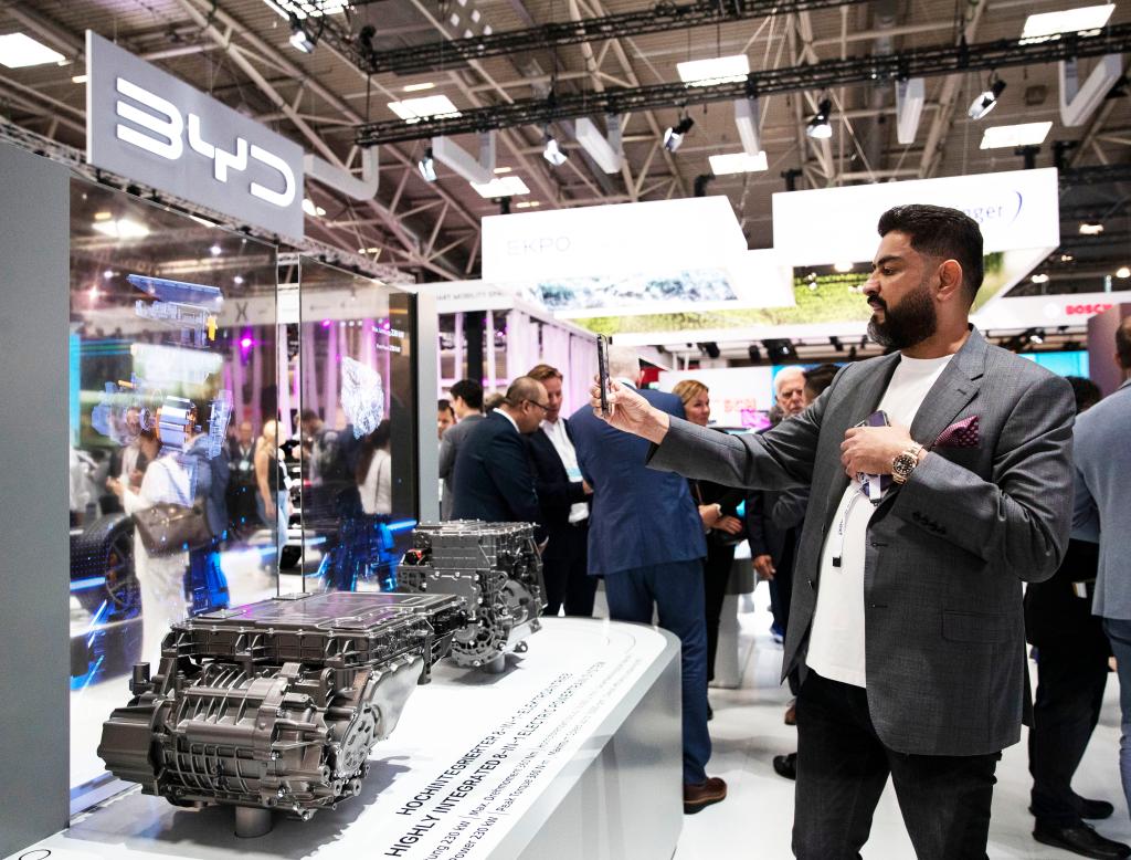 ↑2023年9月4日,一名参观者在德国慕尼黑国际车展媒体预展上拍摄比亚迪的展品。