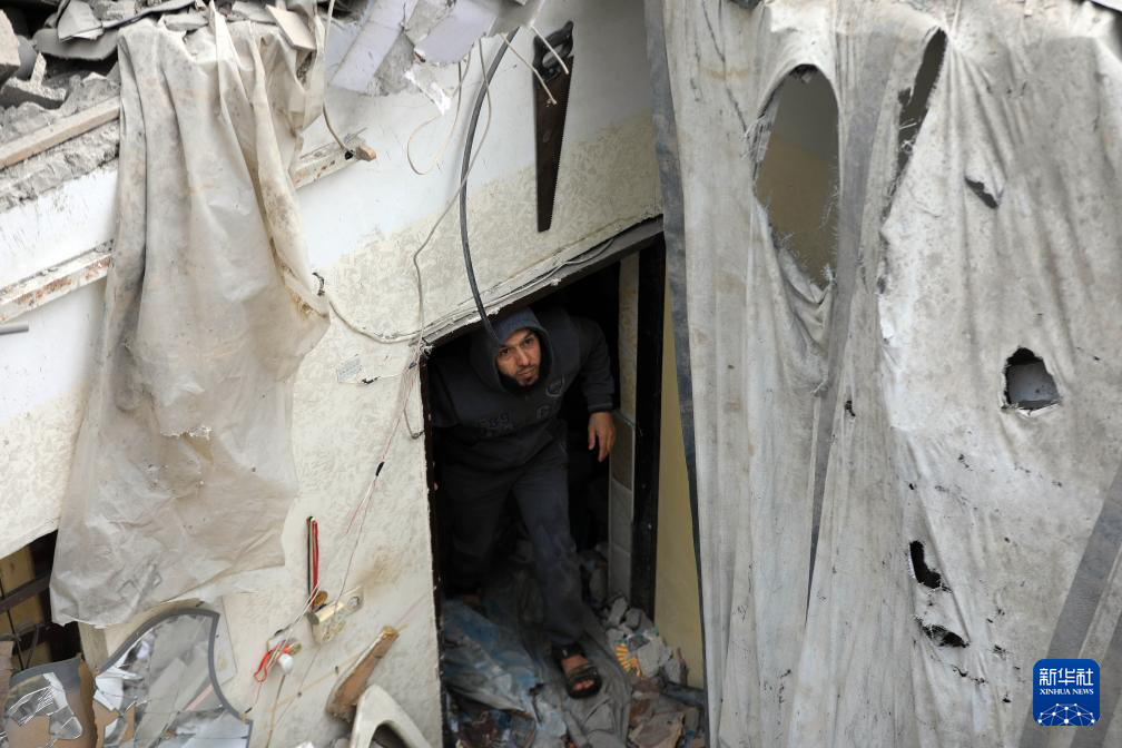 1月17日,在加沙地带南部城市拉法,一名男子查看以军空袭后的受损建筑。