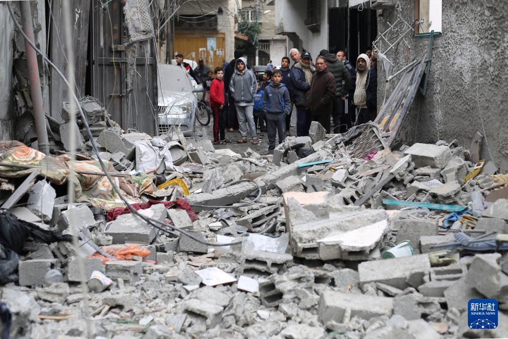 1月17日,在加沙地带南部城市拉法,人们查看以军空袭后的受损建筑。