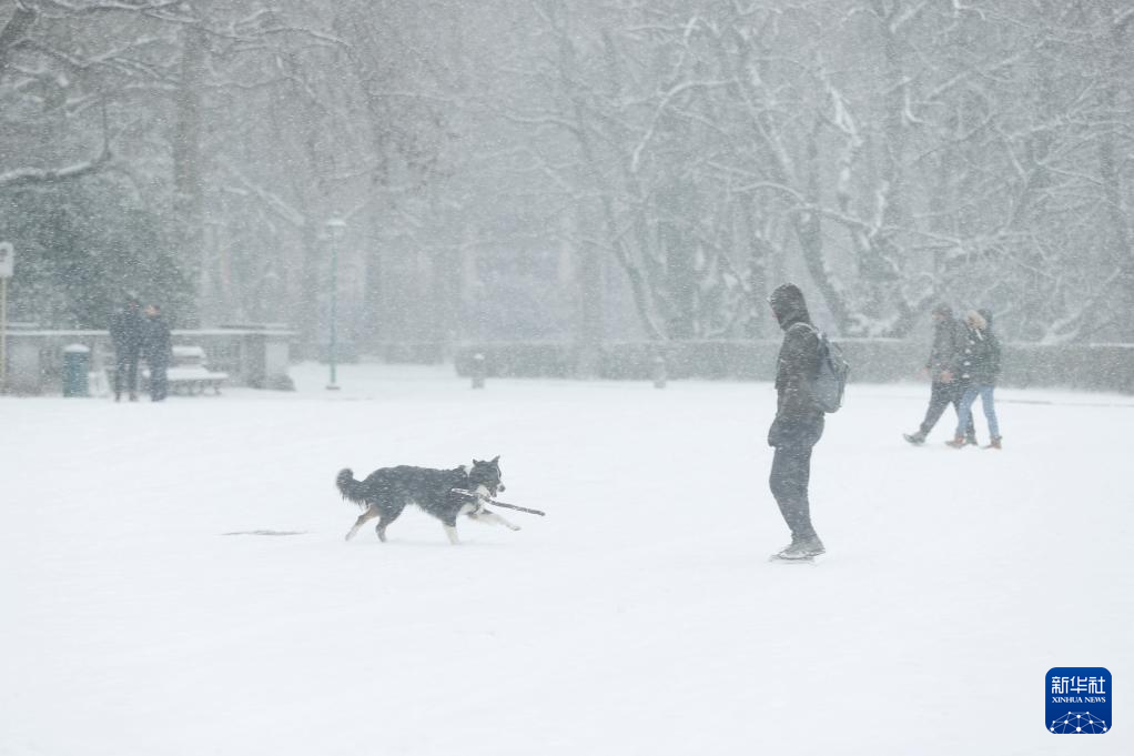 1月17日,在比利时布鲁塞尔,人们冒雪在五十年宫公园游玩。