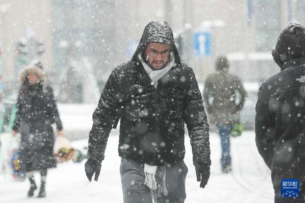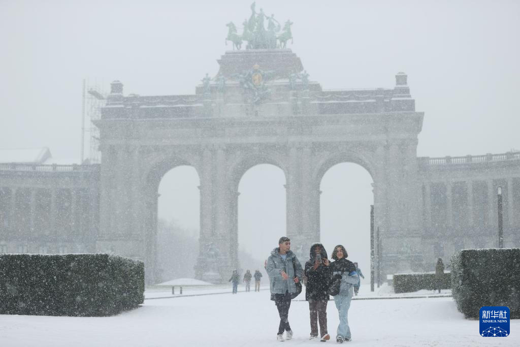 1月17日,在比利时布鲁塞尔,人们冒雪出行。