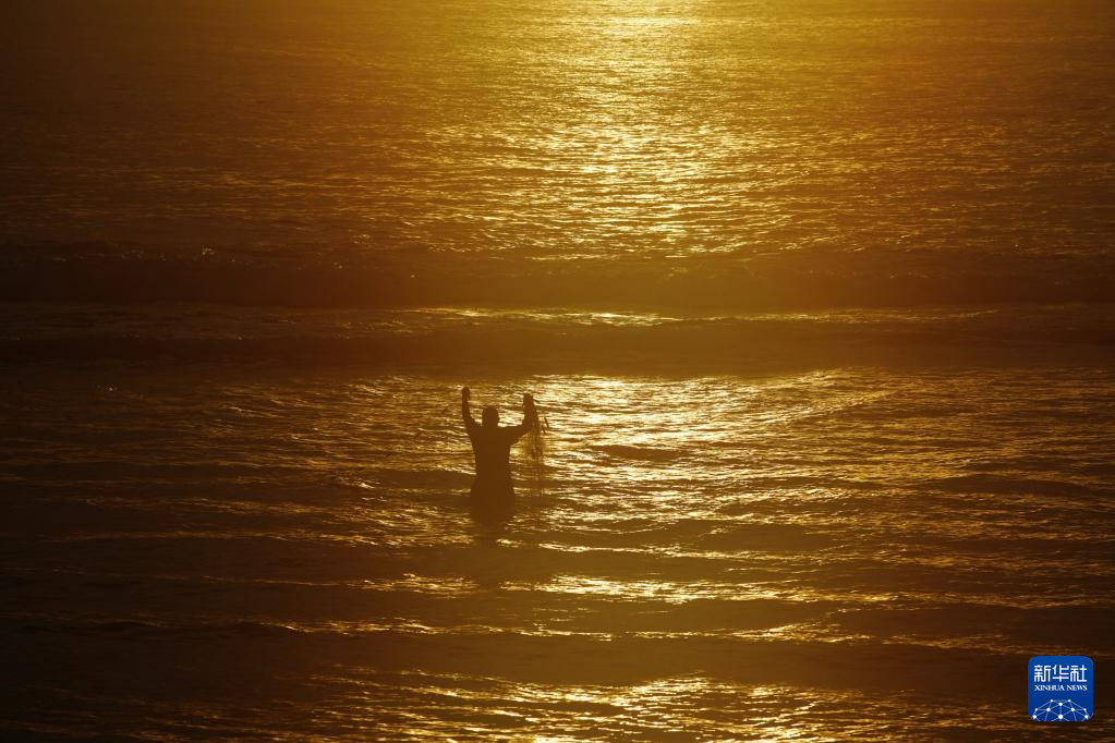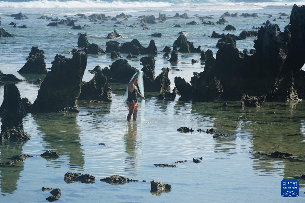 1月18日,在瑙鲁国际机场附近的海边,一名男子使用渔网捕获海产品。