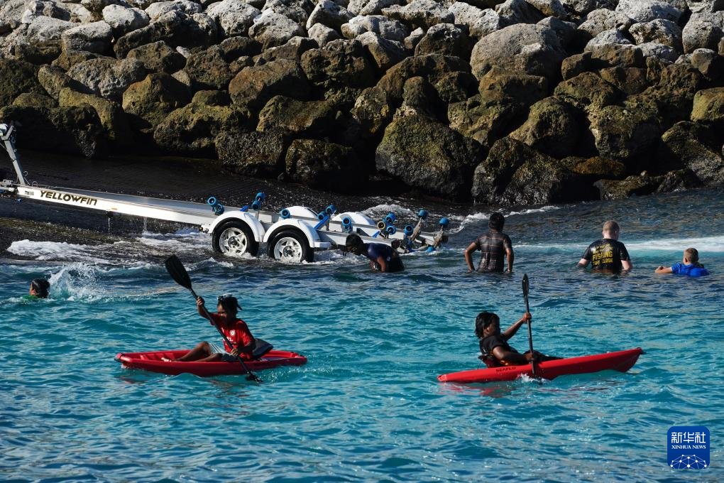 1月18日,在瑙鲁阿尼巴雷湾,人们在海面上戏水休闲。