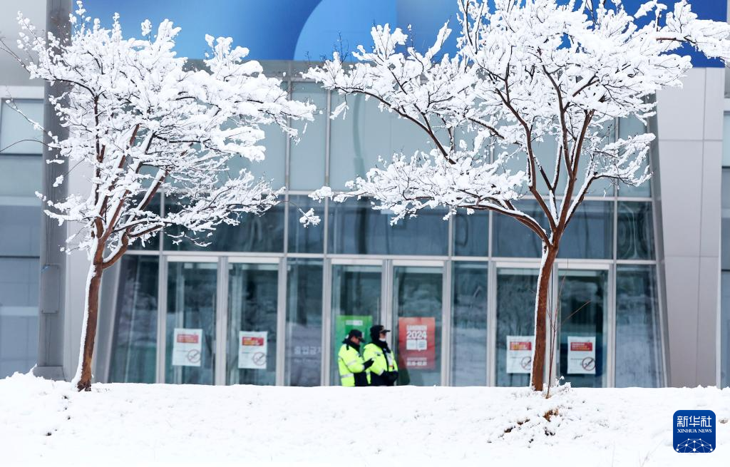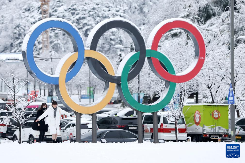 1月21日,在韩国江陵市奥林匹克公园,人们走在积雪的路面上。