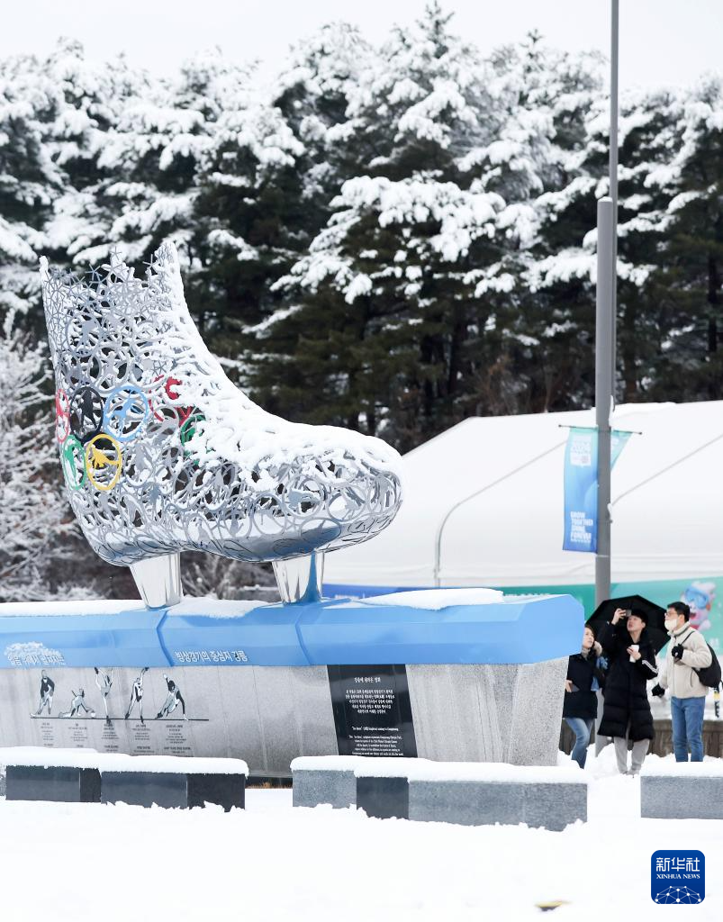 1月21日,人们在韩国江陵市奥林匹克公园拍摄雪景。
