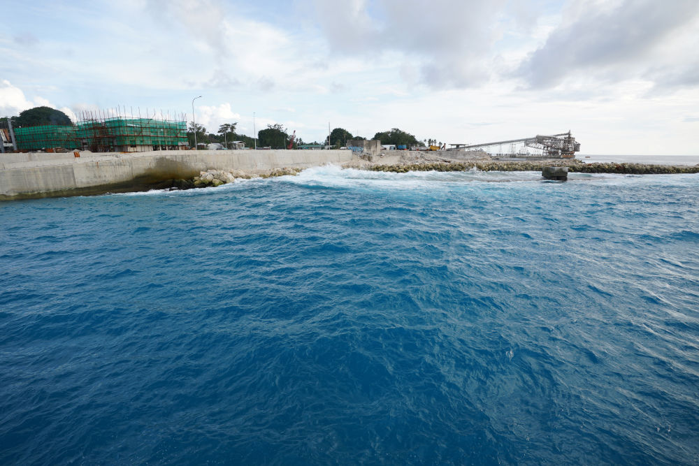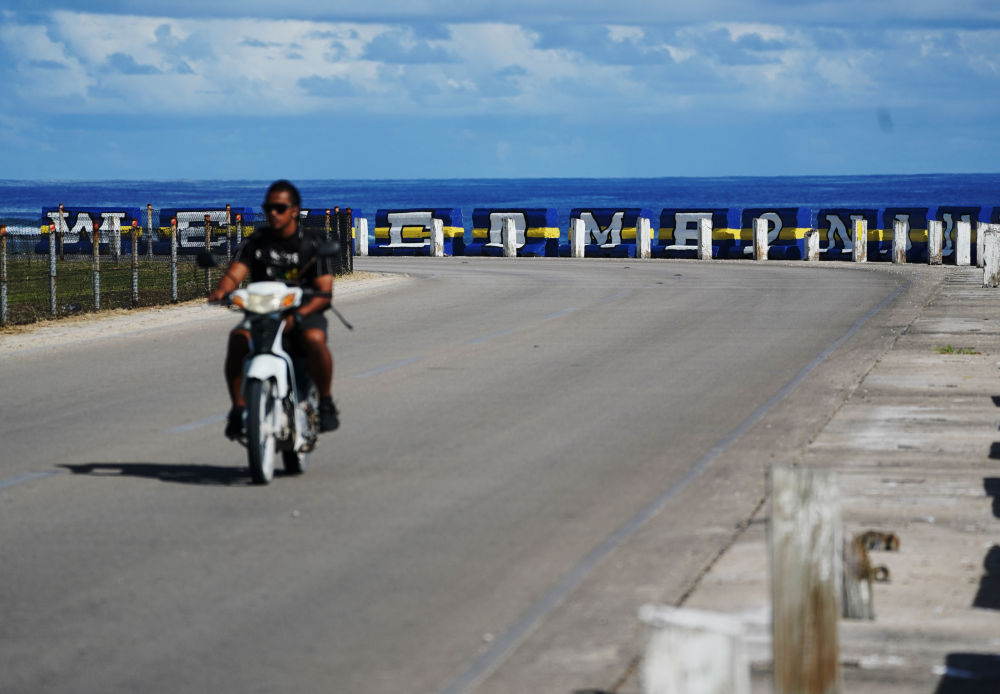 ↑摩托车行驶在瑙鲁国际机场附近海边的公路上