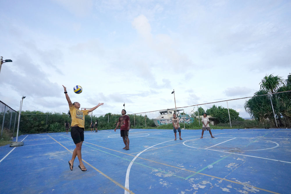 ↑几名男子在瑙鲁国际机场附近的海边使用渔网捕获海产品