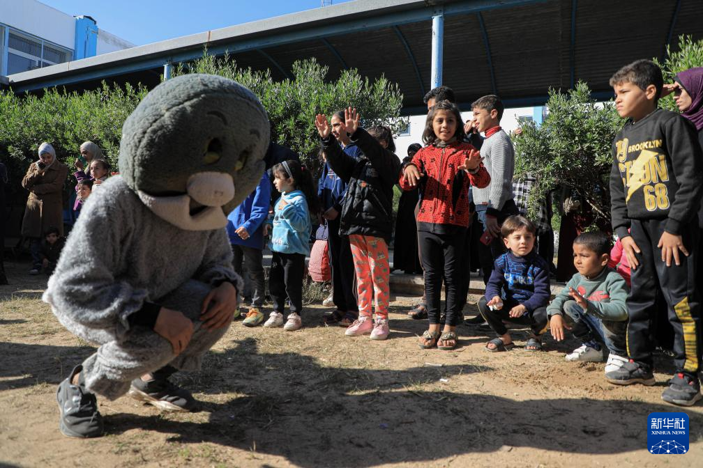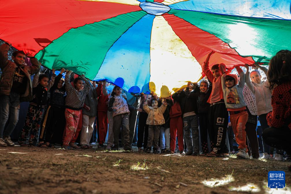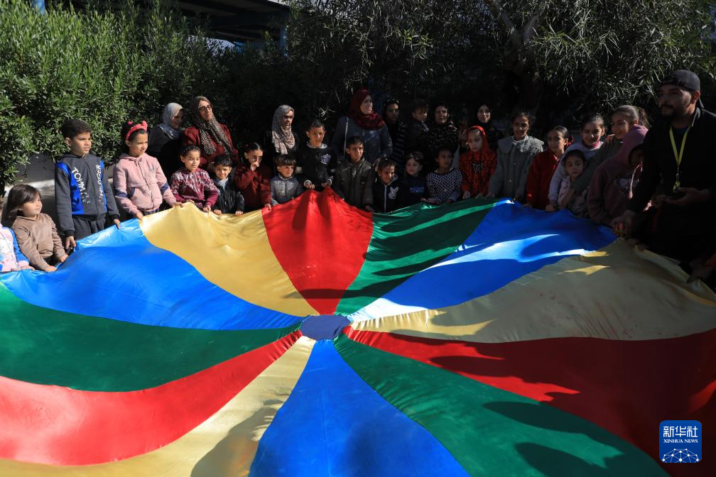 1月24日,在加沙地带南部城市拉法的一所学校内,孩子们参加当地志愿者组织的关爱儿童的活动。