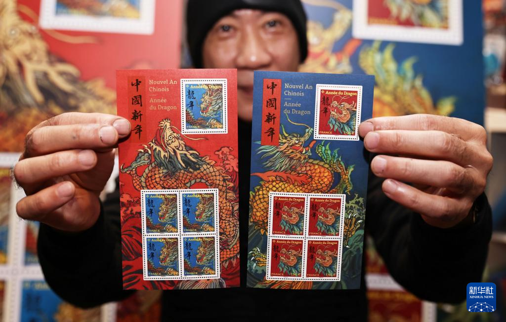 为迎接中国农历新年,法国邮政集团26日在巴黎举行中国龙年生肖纪念邮票发行仪式。中国龙年生肖纪念邮票共两款,由法国华人艺术家陈江洪设计。其中,一款邮资1.29欧元,票面是蓝色背景上绘制着一条翱翔的飞龙;另一款邮资1.96欧元,票面是红色背景衬托着一颗昂首向上的龙头。两款邮票票面上均用中文和法语书写着“龙年”字样。