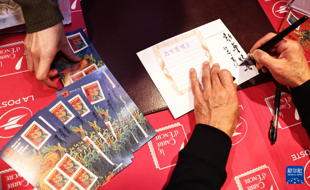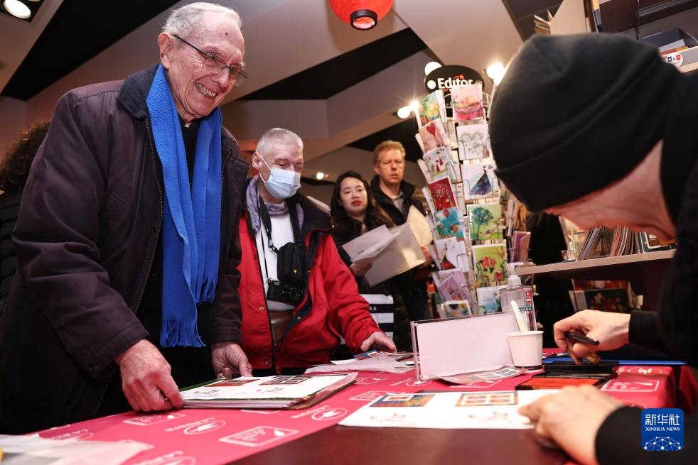 1月26日,在法国巴黎举行的发行仪式上,邮票设计者陈江洪为当地集邮爱好者签字留念。