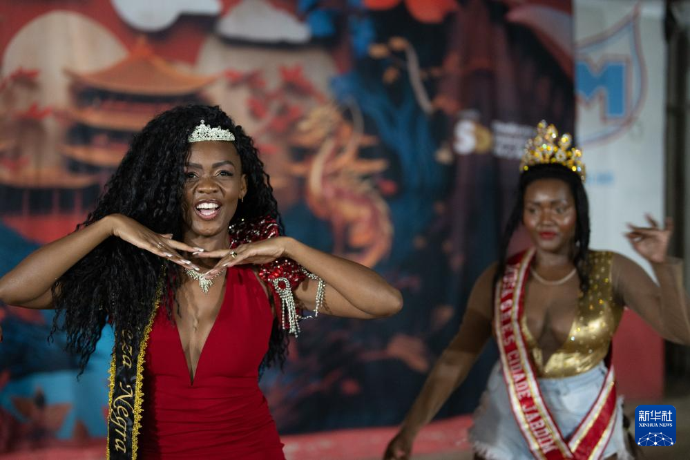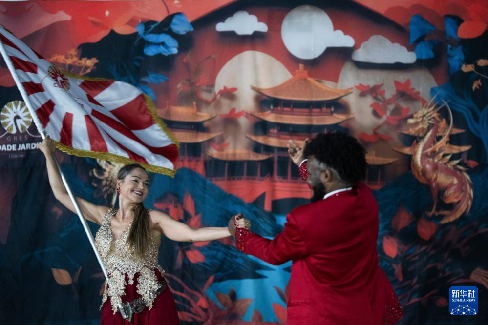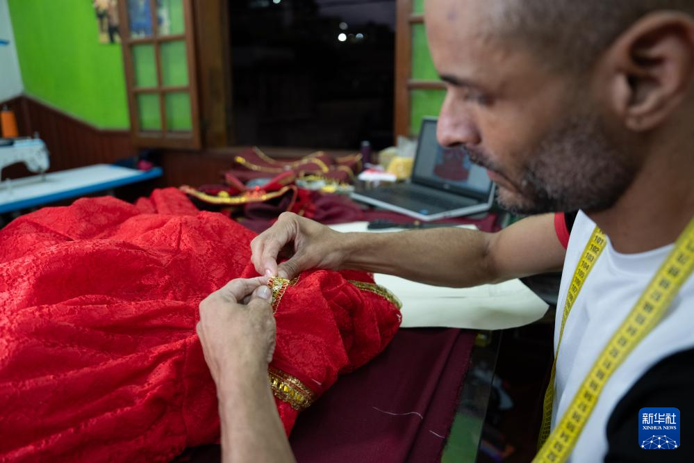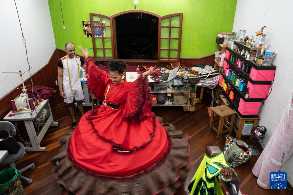 1月24日,在巴西贝洛奥里藏特,“城市花园”舞校副校长提亚妮·玛格丽特在裁缝工作室试穿“紫禁城方阵”服装。