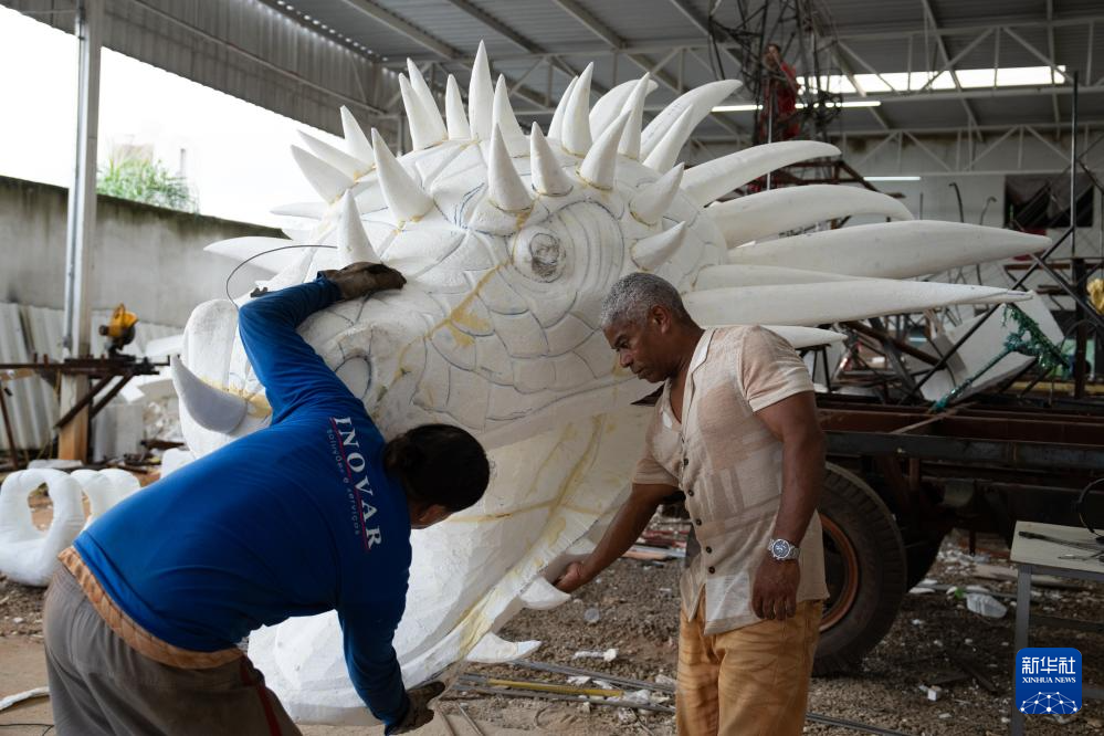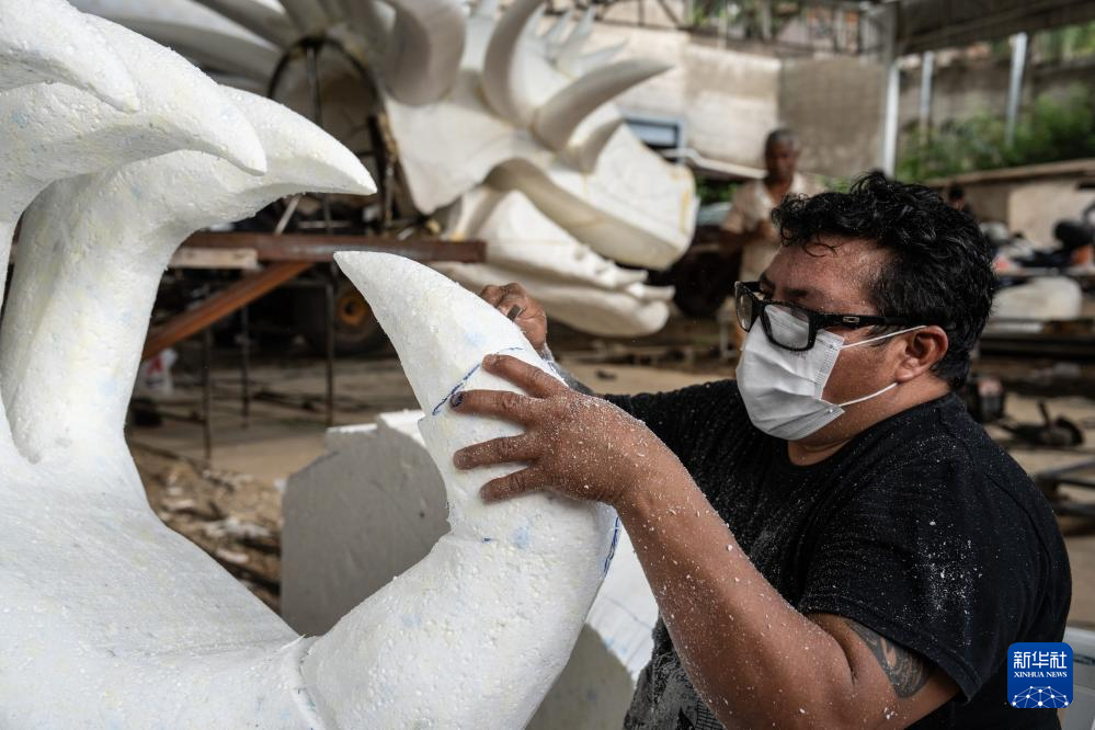 1月24日,在巴西贝洛奥里藏特市的一个作坊里,工人为“城市花园”桑巴舞校赶制“中国龙”造型花车。