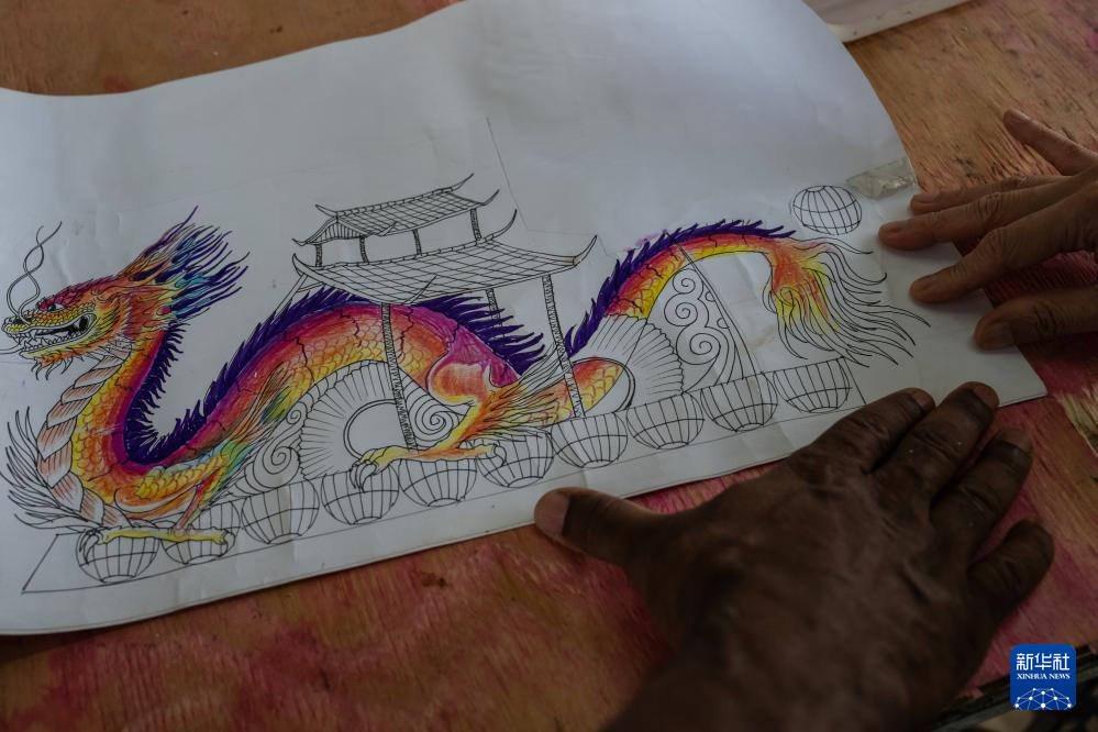 1月24日,在巴西贝洛奥里藏特市的一个作坊里,“城市花园”舞校校长亚历山大·科斯塔·席尔瓦(右)检查工人制作的“中国龙”造型。