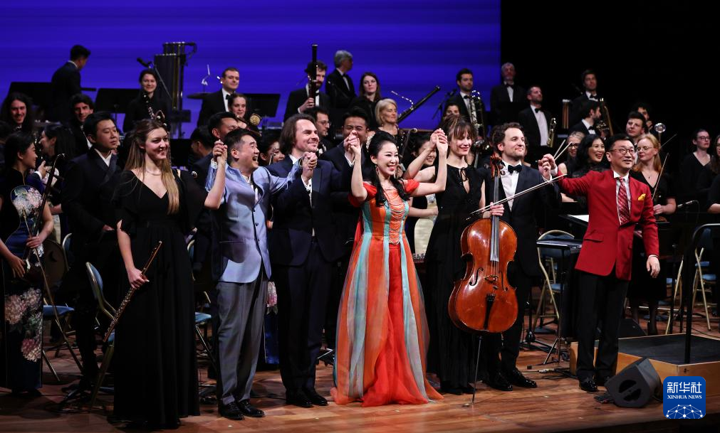 1月31日,在法国巴黎凡尔赛宫皇家歌剧院举行的庆祝中法建交60周年暨中法文化旅游年开幕音乐会上,全体演员向观众致意。