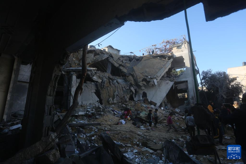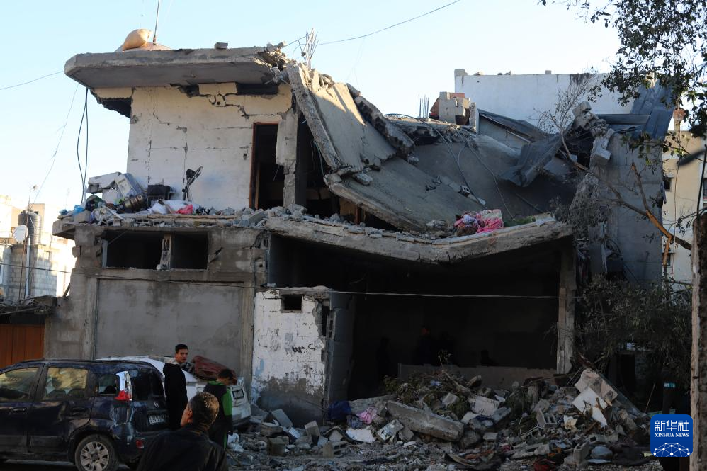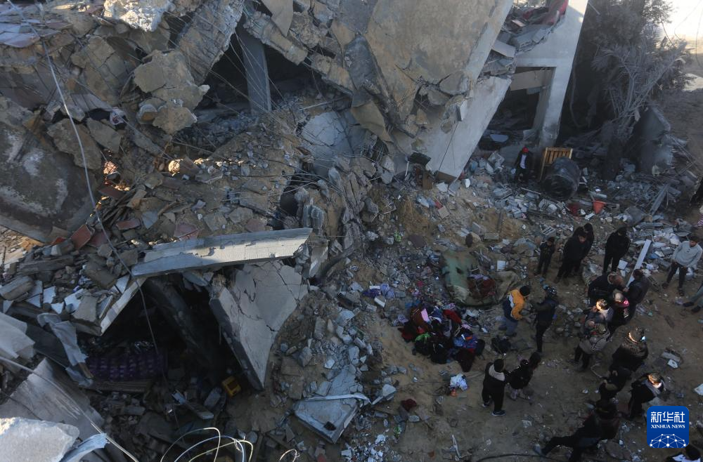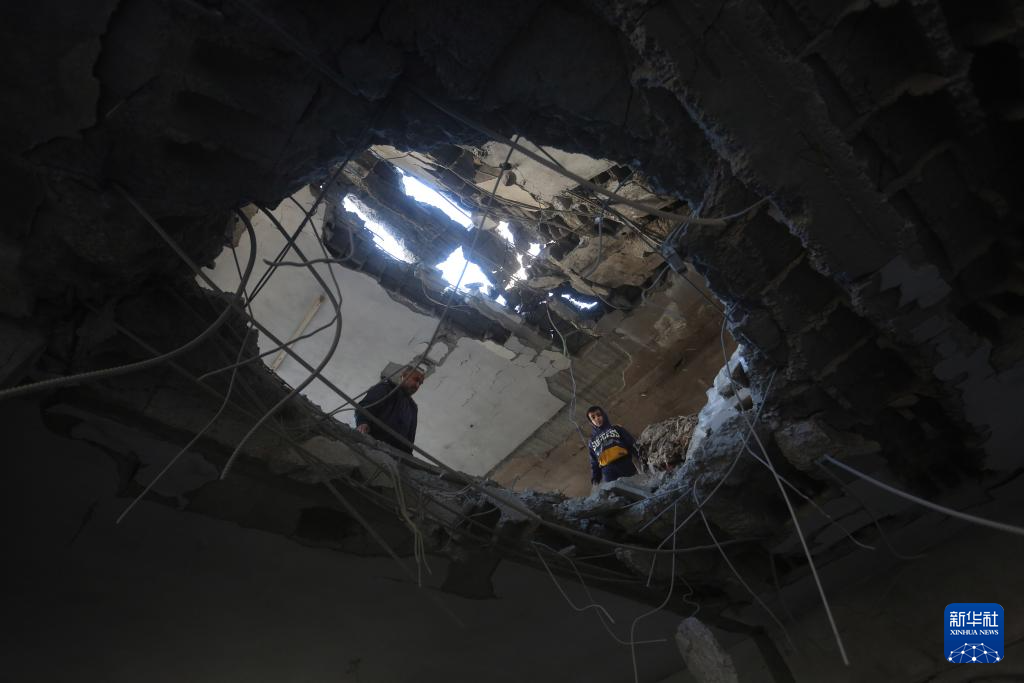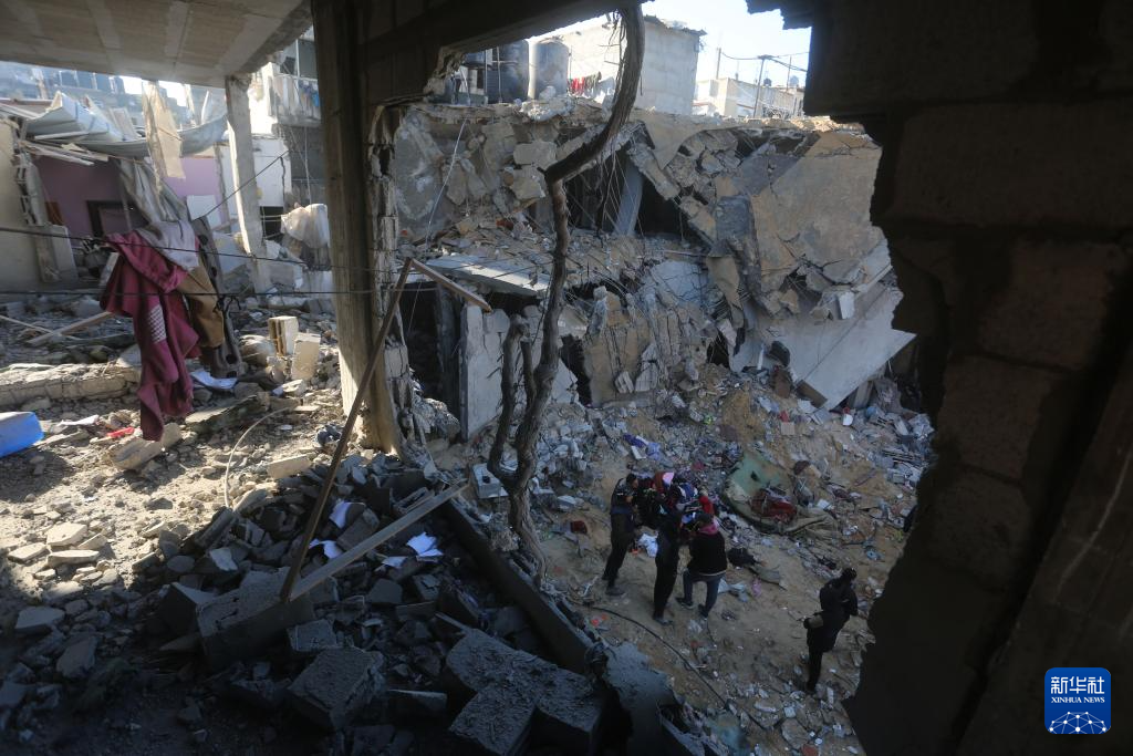 2月3日,在加沙地带南部城市拉法,巴勒斯坦人查看以军空袭后的建筑废墟。