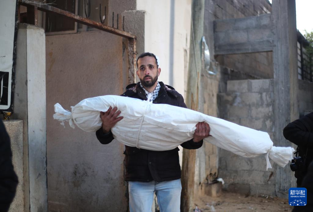 2月3日,在加沙地带南部城市拉法,巴勒斯坦人抱着死者的遗体。