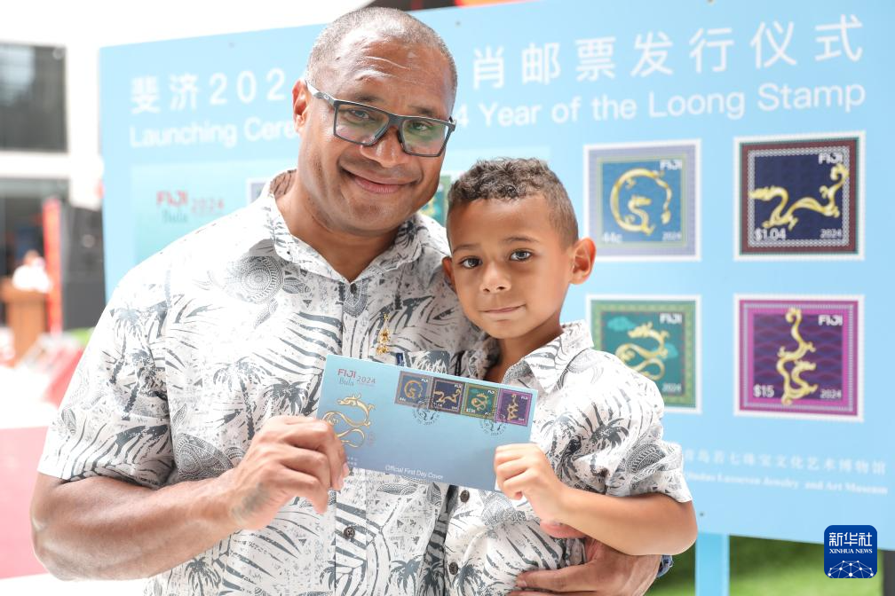 2月3日,在斐济举行的中国农历龙年生肖邮票及首日封发行仪式上,一对父子展示中国农历龙年生肖邮票及首日封。