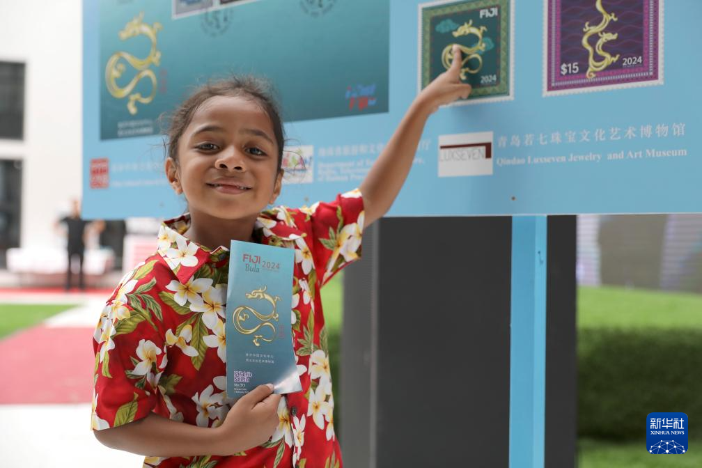 2月3日,在斐济举行的中国农历龙年生肖邮票及首日封发行仪式上,一名斐济儿童在中国农历龙年生肖邮票介绍展板前留影。
