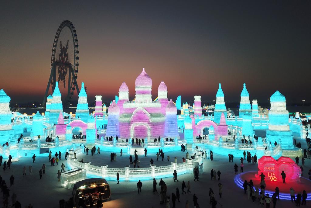 游客在哈尔滨冰雪大世界园区内游玩(无人机照片,1月9日摄)。新华社记者 王建威 摄