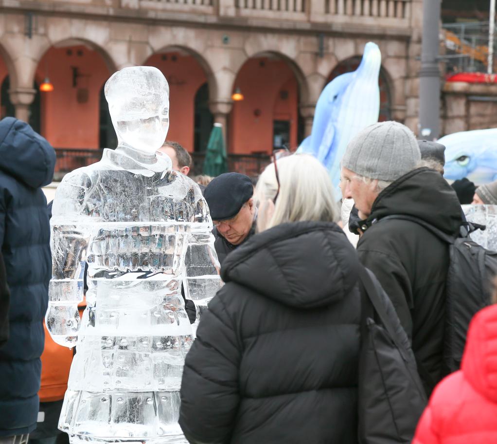 这是1月28日拍摄的在挪威首都奥斯陆展出的冰雕。新华社发(陈雅琴摄)