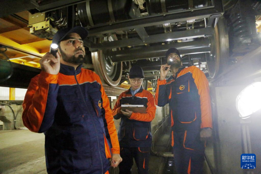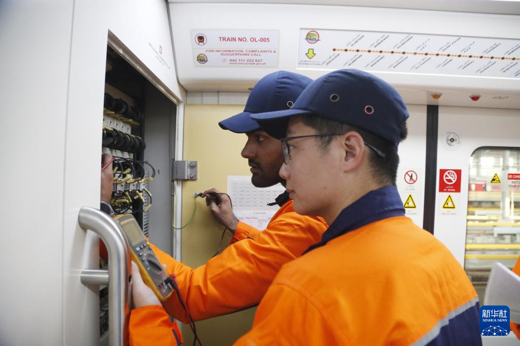 2月1日,巴基斯坦拉合尔轨道交通橙线项目中巴方员工在检修列车。