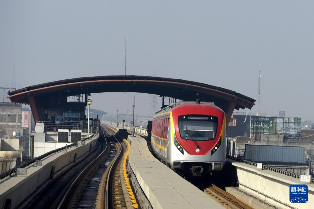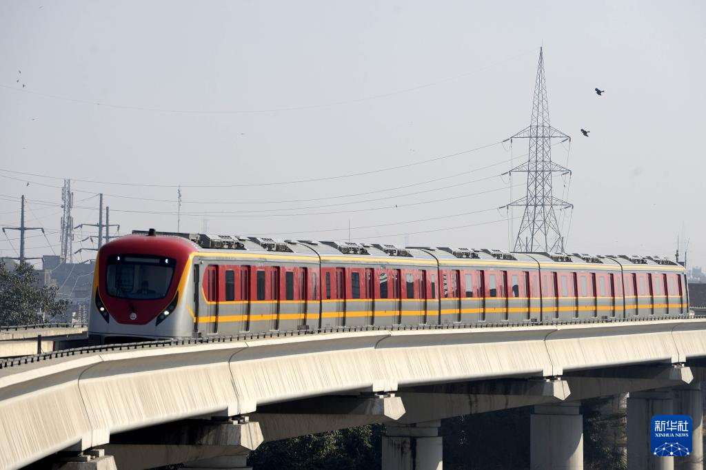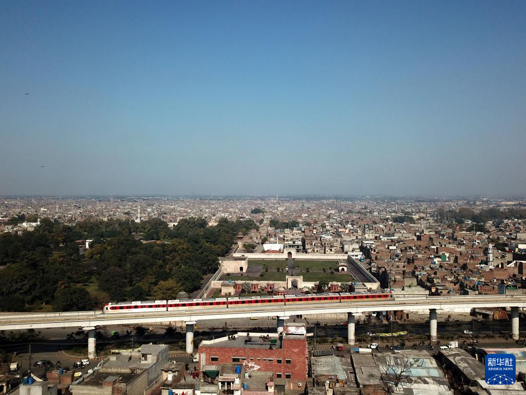 2月2日,在巴基斯坦拉合尔,橙线地铁列车途径当地游览胜地夏利玛花园。