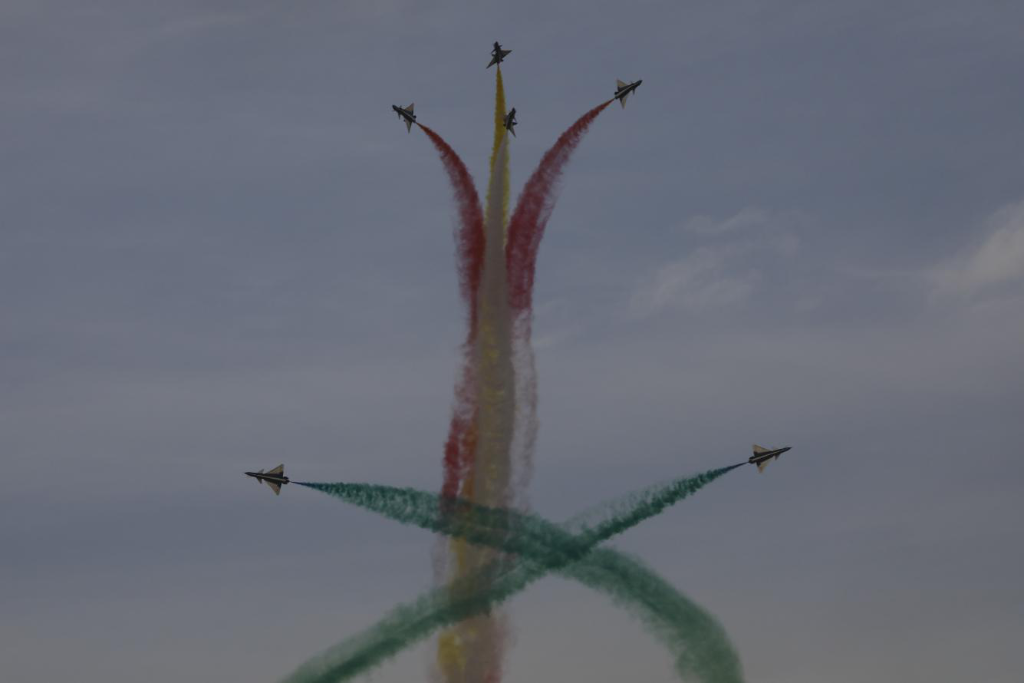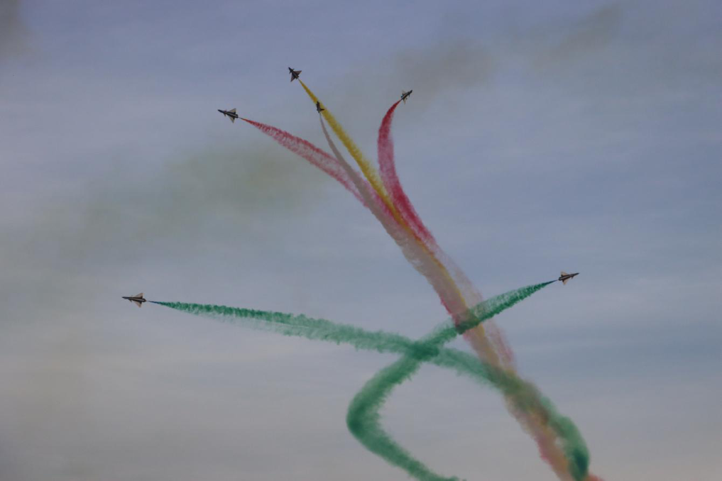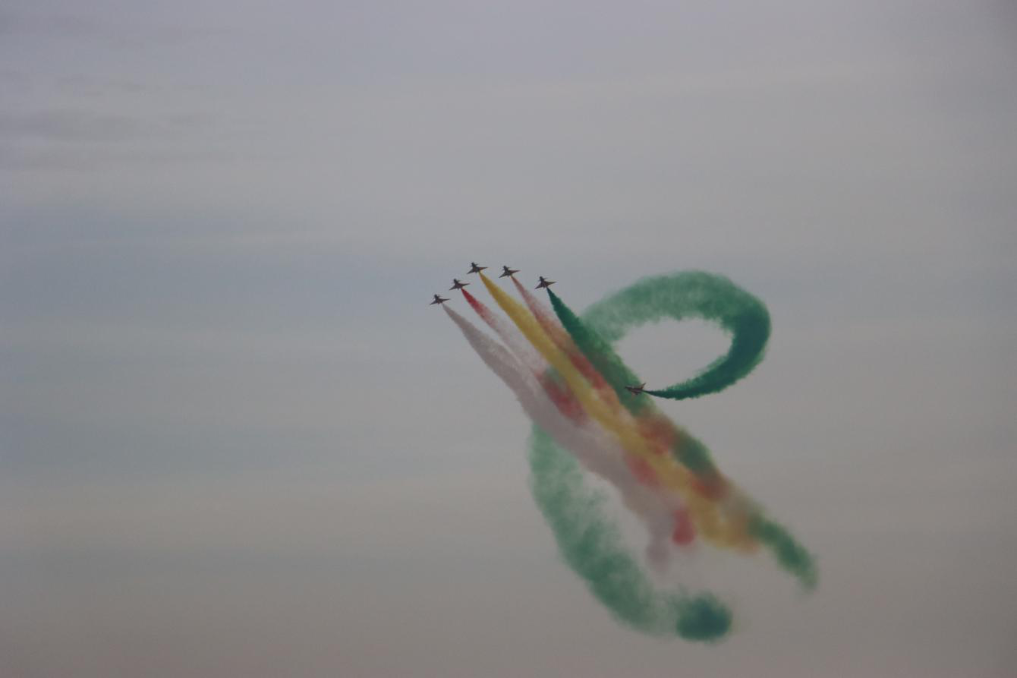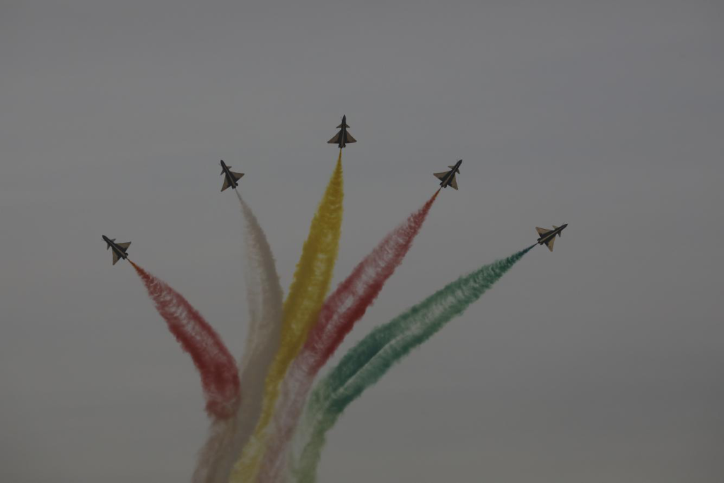 当日的飞行表演中,空军八一飞行表演队连续做出“四机垂直开花”“五机水平开花”“六机分组开花”等一系列高难度表演动作。由象征中沙两国国旗的“红黄白绿”四种颜色组成的彩色拉烟,在高空绽放开花,时而如牵牛花开、金钟倒挂,时而如天女散花、五彩绚烂,让利雅得的上空更加色彩斑斓。