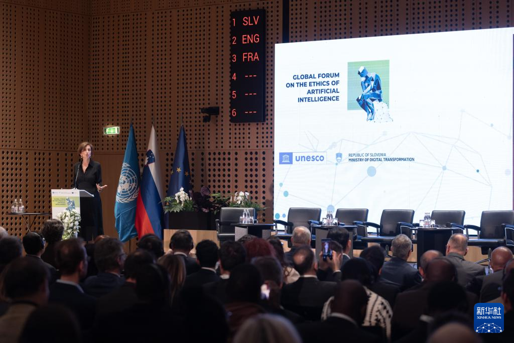 2月5日,联合国教科文组织总干事阿祖莱在斯洛文尼亚克拉尼举行的第二届全球人工智能伦理论坛上发表演讲。