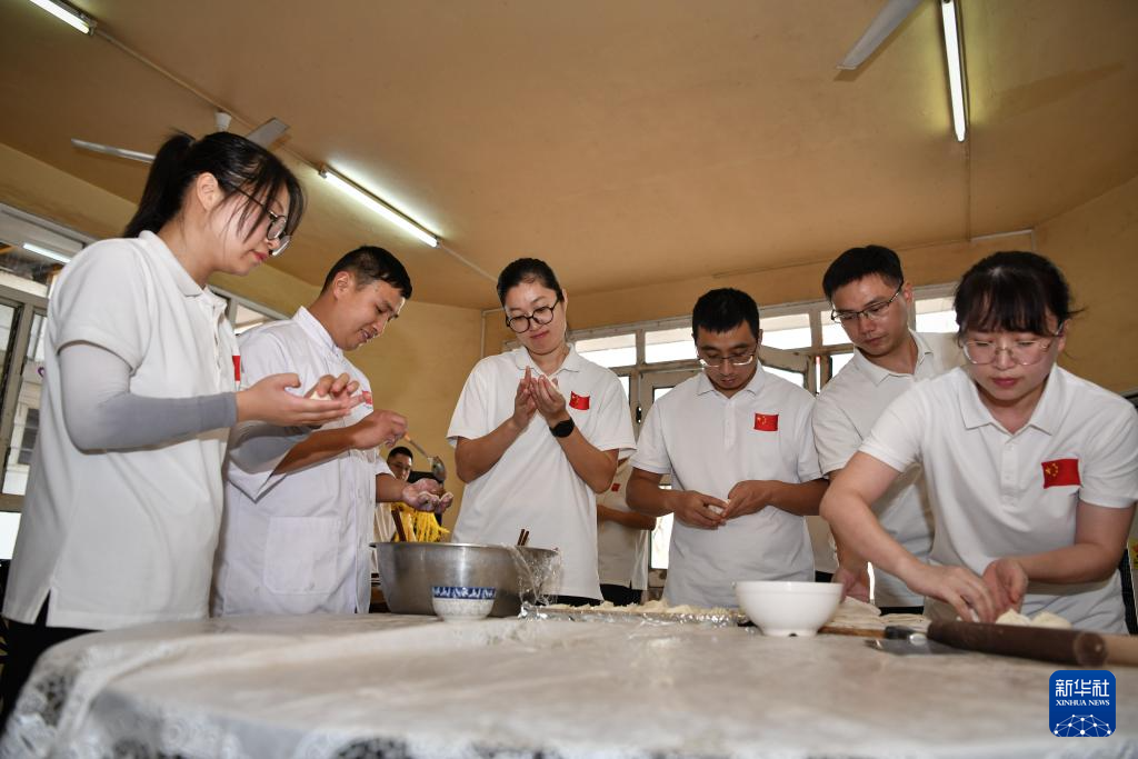 2月4日,在中非共和国首都班吉,援中非中国医疗队队员在位于班吉友谊医院的驻地内一起包饺子。新华社记者 韩旭 摄