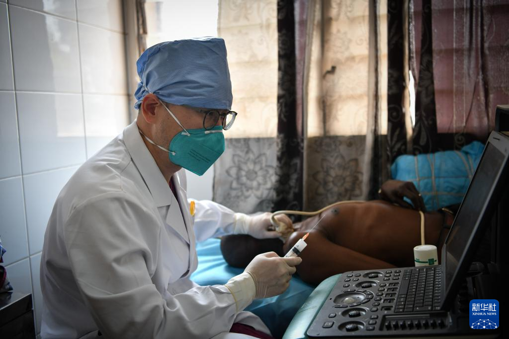 2月5日,在中非共和国班吉,援中非中国医疗队麻醉科医生金苍元在班吉友谊医院为患者做镇痛治疗。新华社记者 韩旭 摄