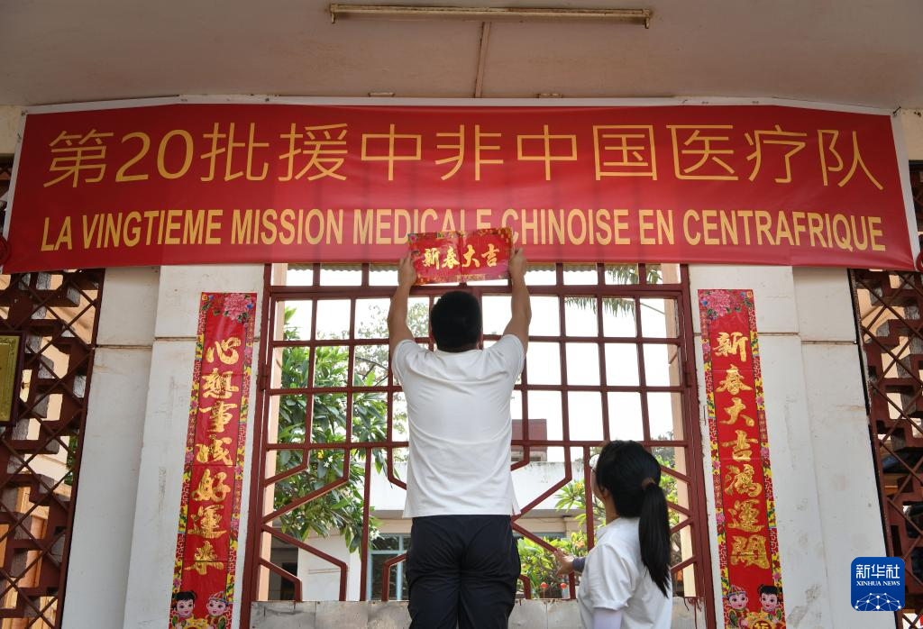 2月4日,在中非共和国首都班吉,援中非中国医疗队队员在位于班吉友谊医院的驻地内贴对联。新华社记者 韩旭 摄