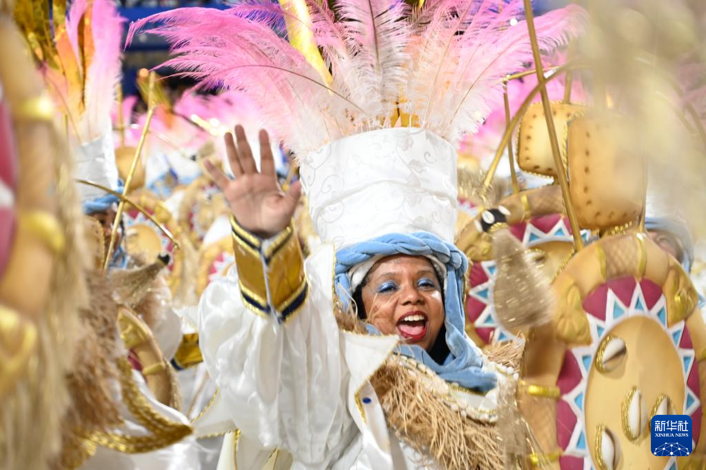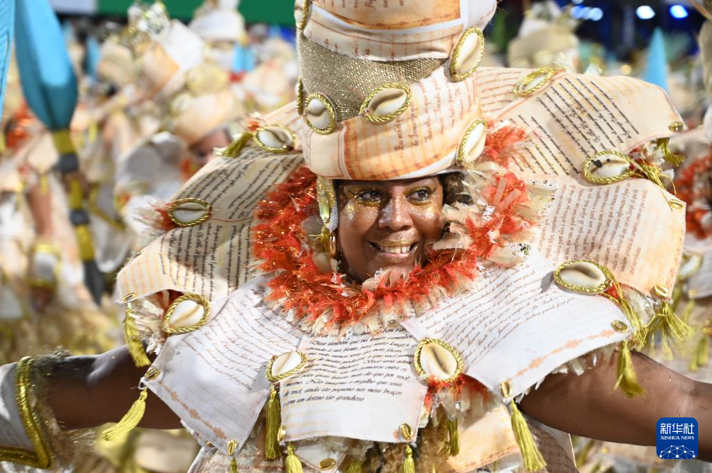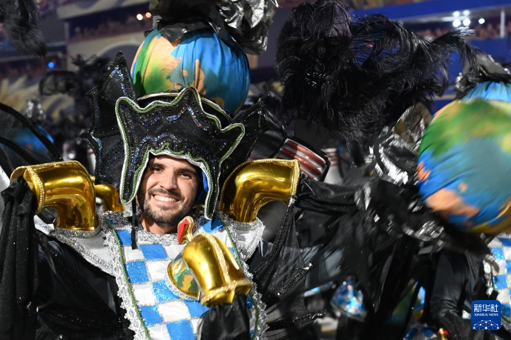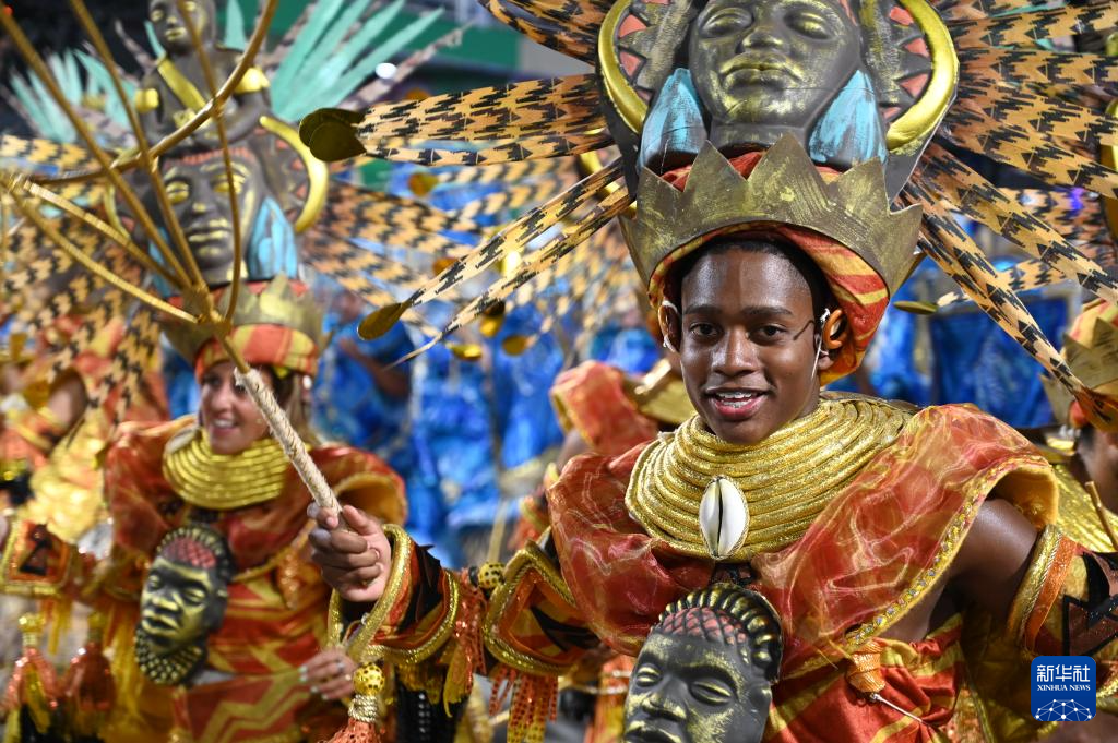 2月13日凌晨,在巴西里约热内卢桑巴大道,桑巴舞校的演员参加狂欢节游行。