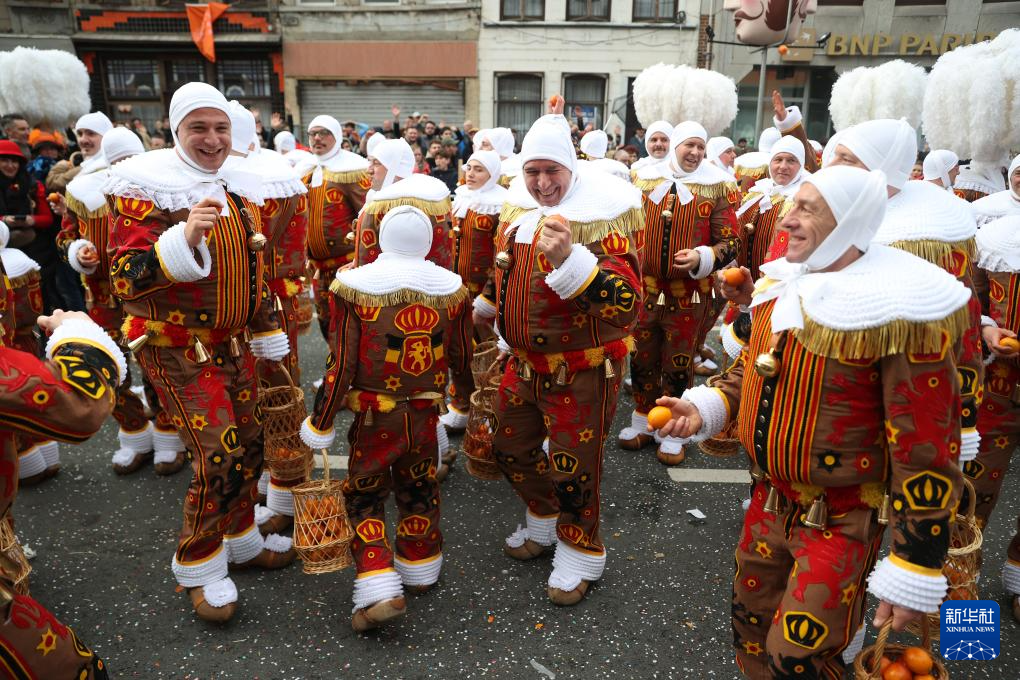2月13日,在比利时南部小镇班什,装扮成“憨人”形象、头戴鸵鸟毛帽子的当地居民手拿血橙参加班什狂欢节游行。